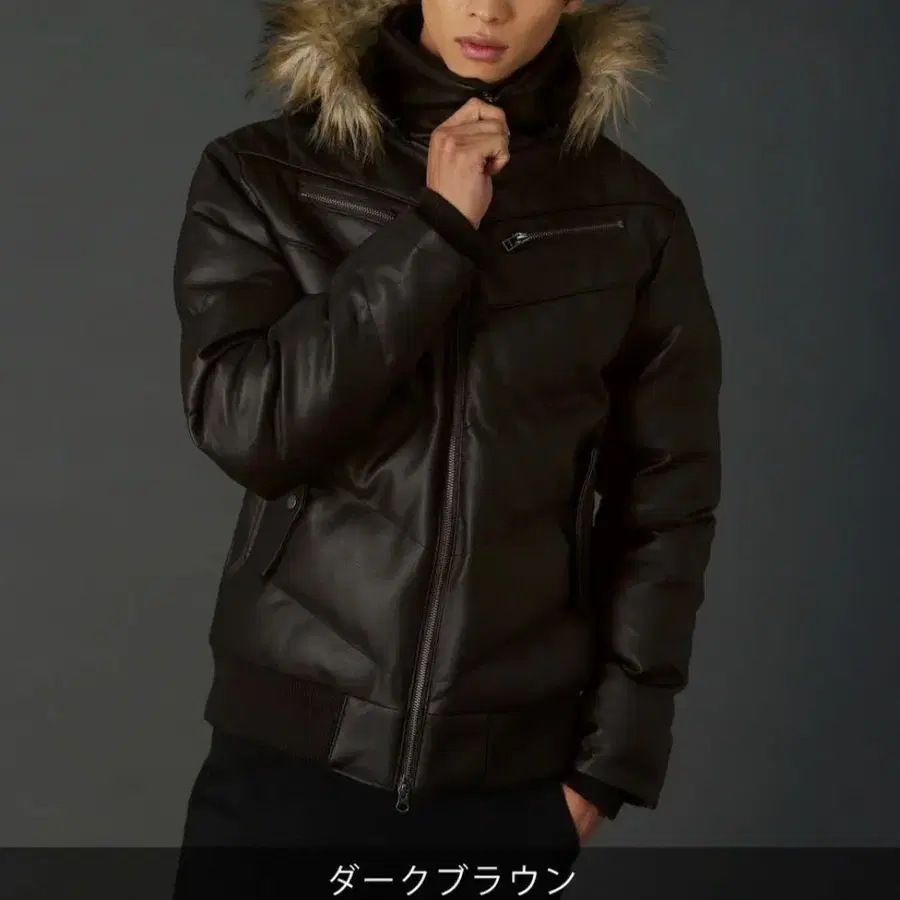 퍼가 달린 다크 브라운 다운 자켓, 지퍼 달린 포켓 있음.
