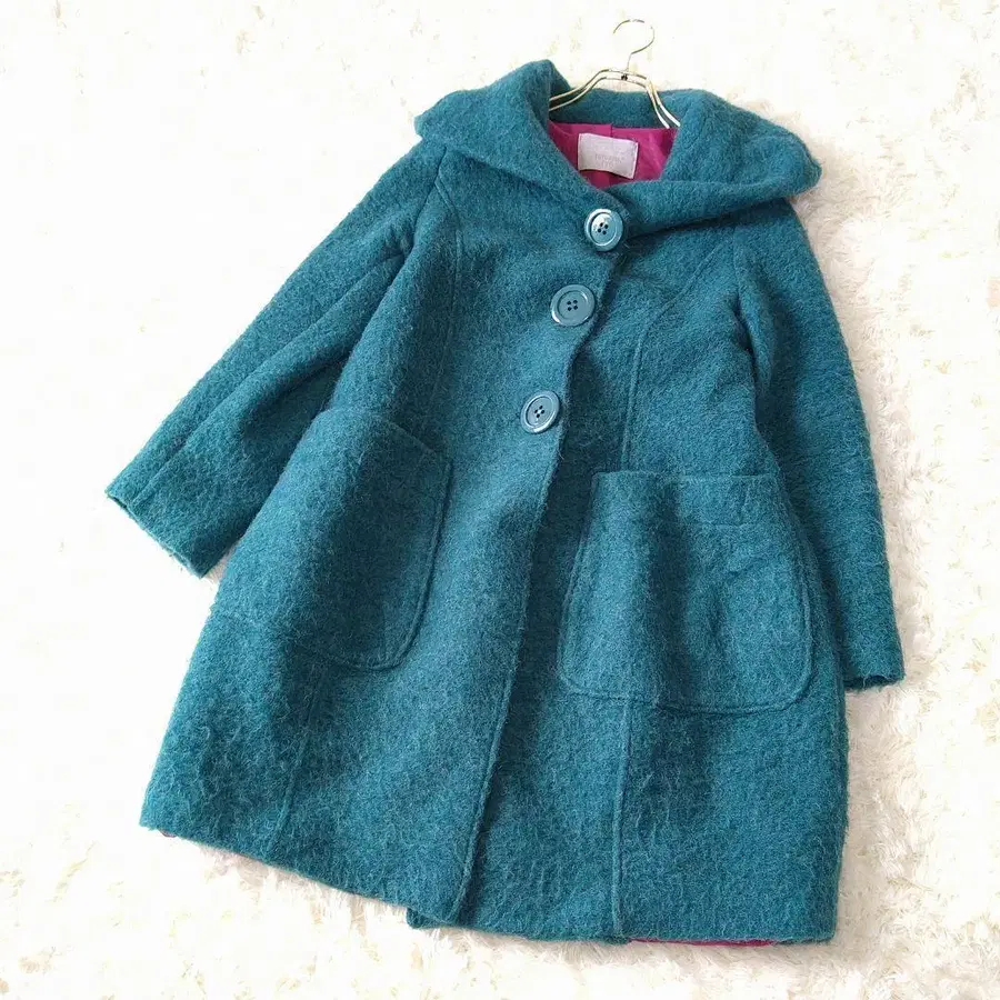 ☑ 상품: 터콰이즈 울 혼방 후드 부착 코트, 단추식 디자인.
