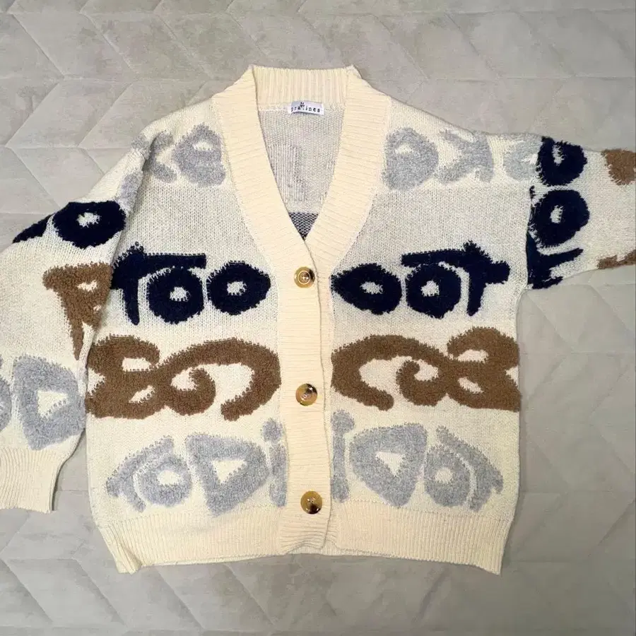 자동 번역되었어요. 원문보기아이보리와 네이비 색상의 로고 디자인이 특징인 니트 가디건.
