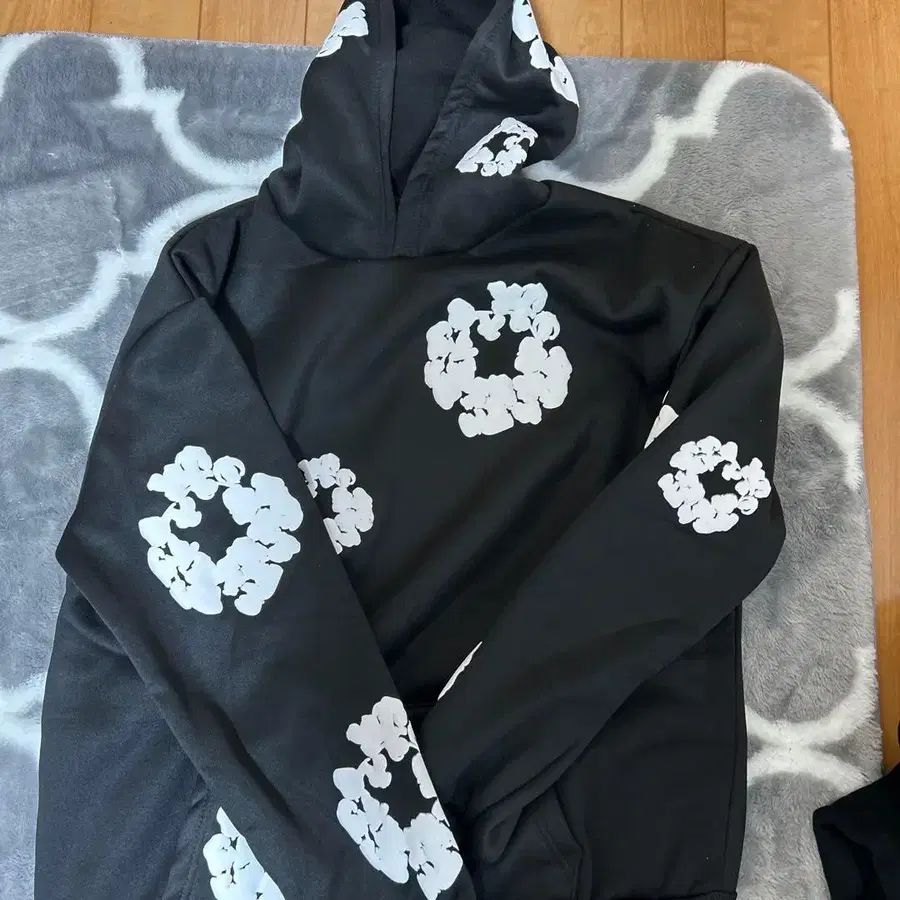 꽃무늬 프린트 후드 부착 후드티 블랙