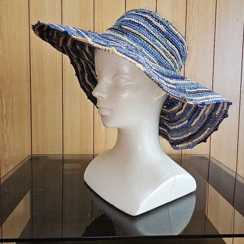 파랑과 화이트 스트라이프 넓은 챙 햇 마다가스카르산 소재 사용