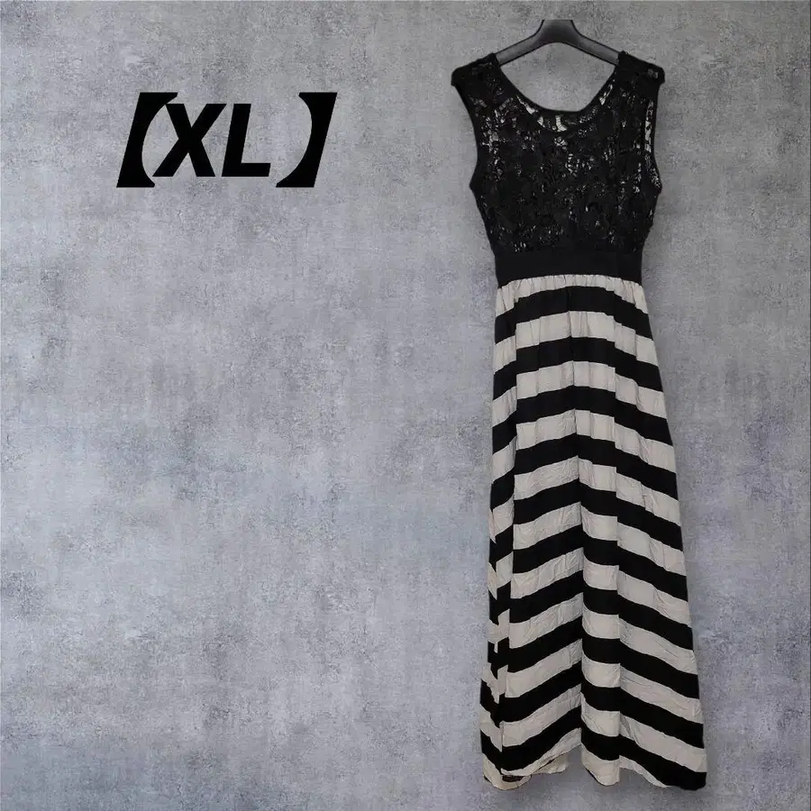 자동 번역되었어요. 원문보기레이스 슬리브리스와 스트라이프 디자인의 롱 원피스, XL 사이즈.