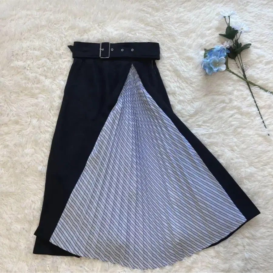 엘렌딕 스트라이프 플리츠 롱 스커트 배색 M 다크 네이비