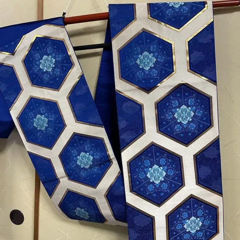 파란색 육각형 꽃무늬 후쿠로 오비 장수하는 거북이 모양