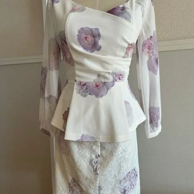 상의는 꽃무늬 프린트 소매의 비침이 여성스럽고, 페미닌하게 보이게 해주는 쉬폰 소재입니다.