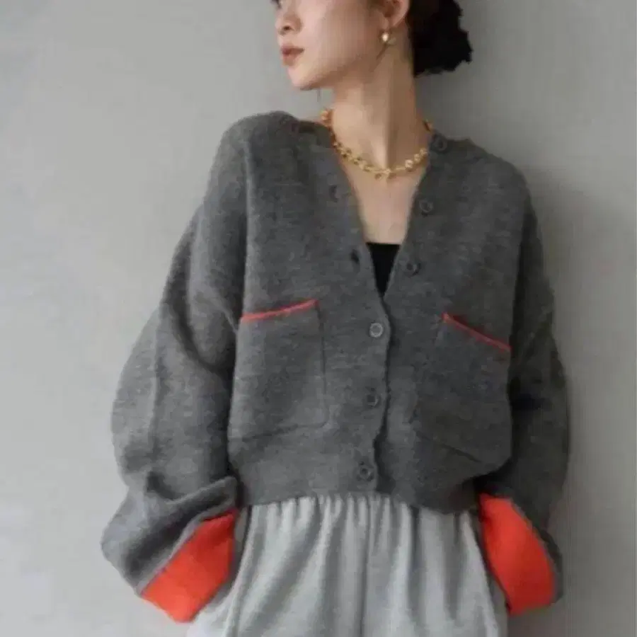 바이컬러 오버 니트 가디건 차콜 lumier 같은 형태