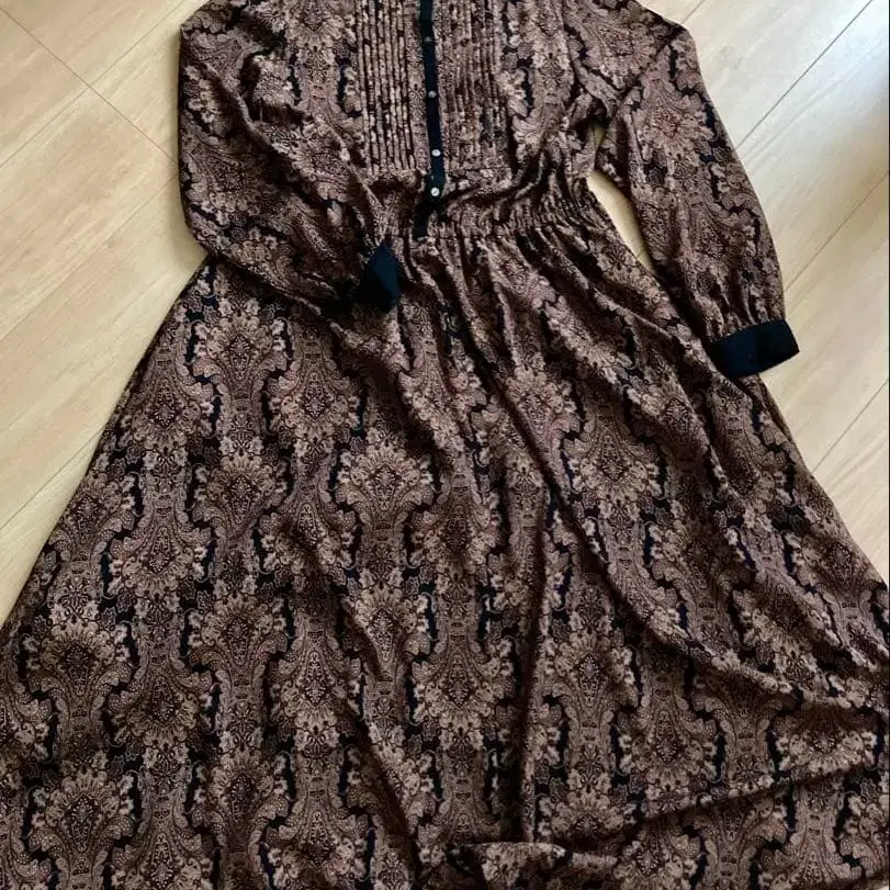 페이즐리 무늬 롱 원피스 긴팔 브라운