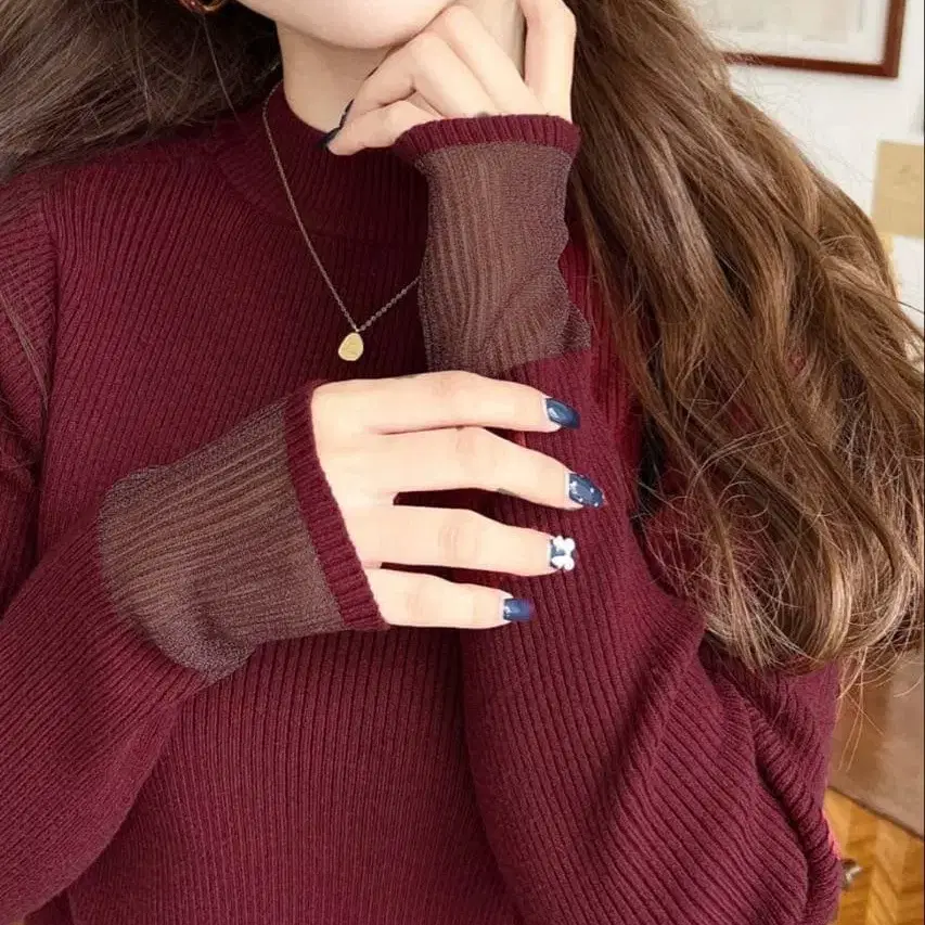 moment 12G 크루넥 소매 시어 리브 니트 풀오버 보르도 M