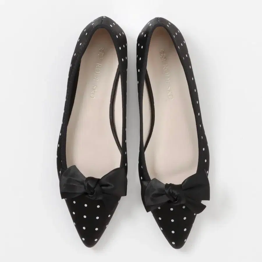 도트 무늬 리본 포함 블랙 플랫슈즈