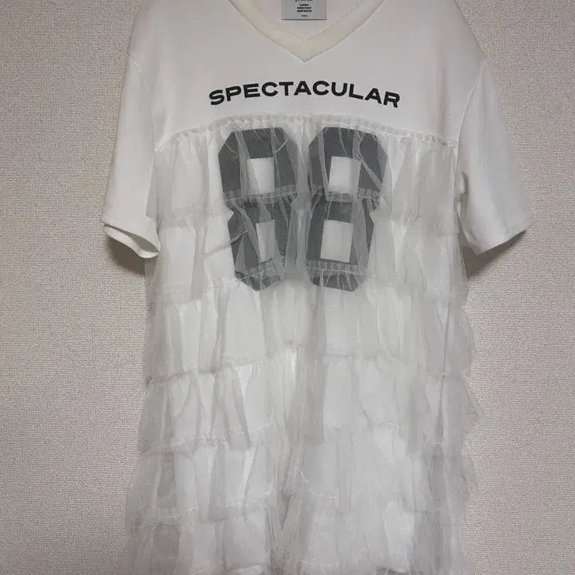 - 디자인: 화이트 색상의 T셔츠 드레스, 프론트에 [ SPECTACULAR ]와 [ 88 ] 프린트