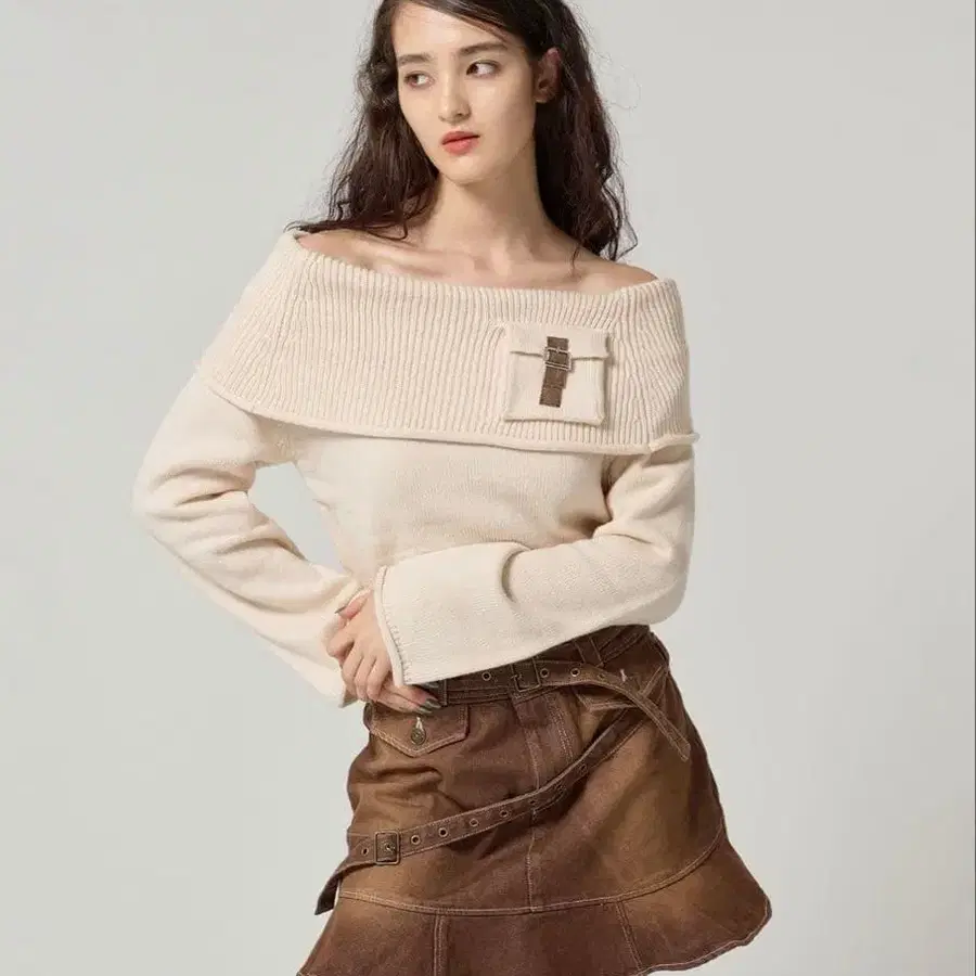 [완판템] 포켓 부착 오프숄더 니트 아이보리 티나조준