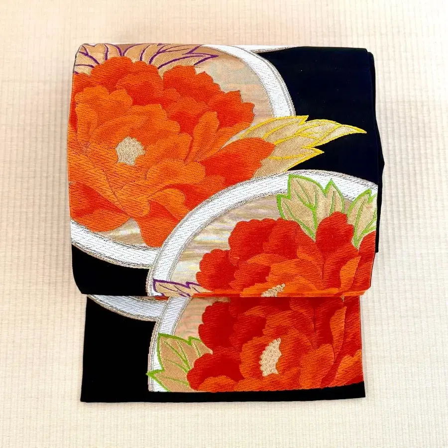 앤티크 블랙 베이스에 오렌지 컬러의 럭셔리한 모란 꽃무늬 후쿠로 오비