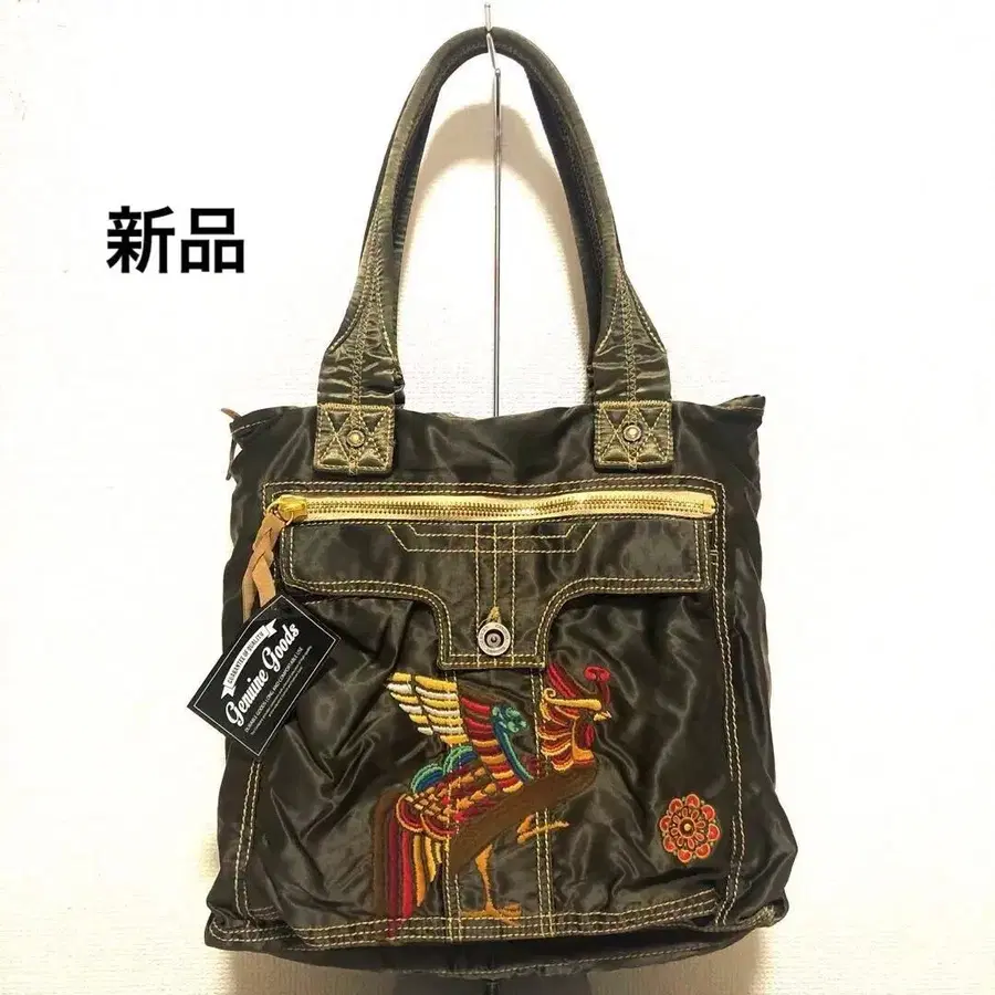 미사용 새상품 토트백 새틴 원단 주작 자수 아메카지 카키