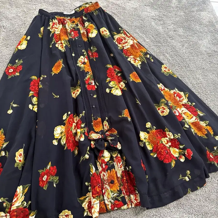 새상품급 INGEBORG 잉게보그 꽃무늬 롱 스커트 네이비 리본