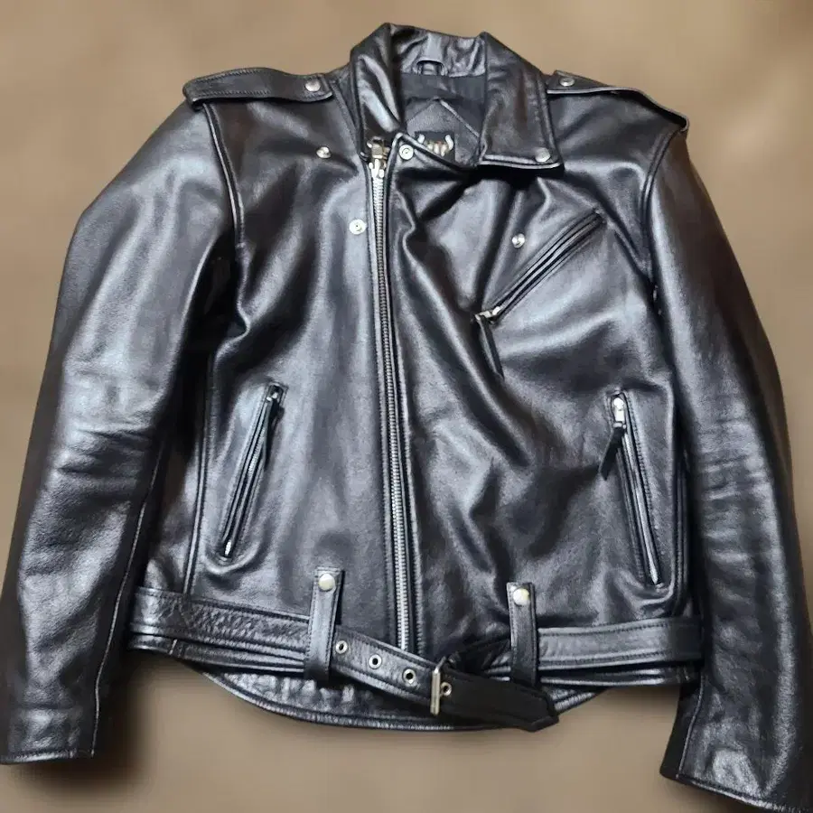 자동 번역되었어요. 원문보기블랙 천연 가죽 더블 라이더 자켓, 지퍼 포켓이 특징입니다.