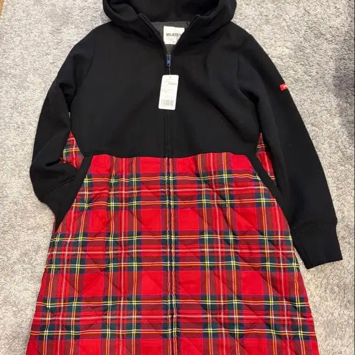 새상품 밀크 페도 충전솜 체크 퀼팅 콤비 후드 롱 코트 절개 블랙 레드