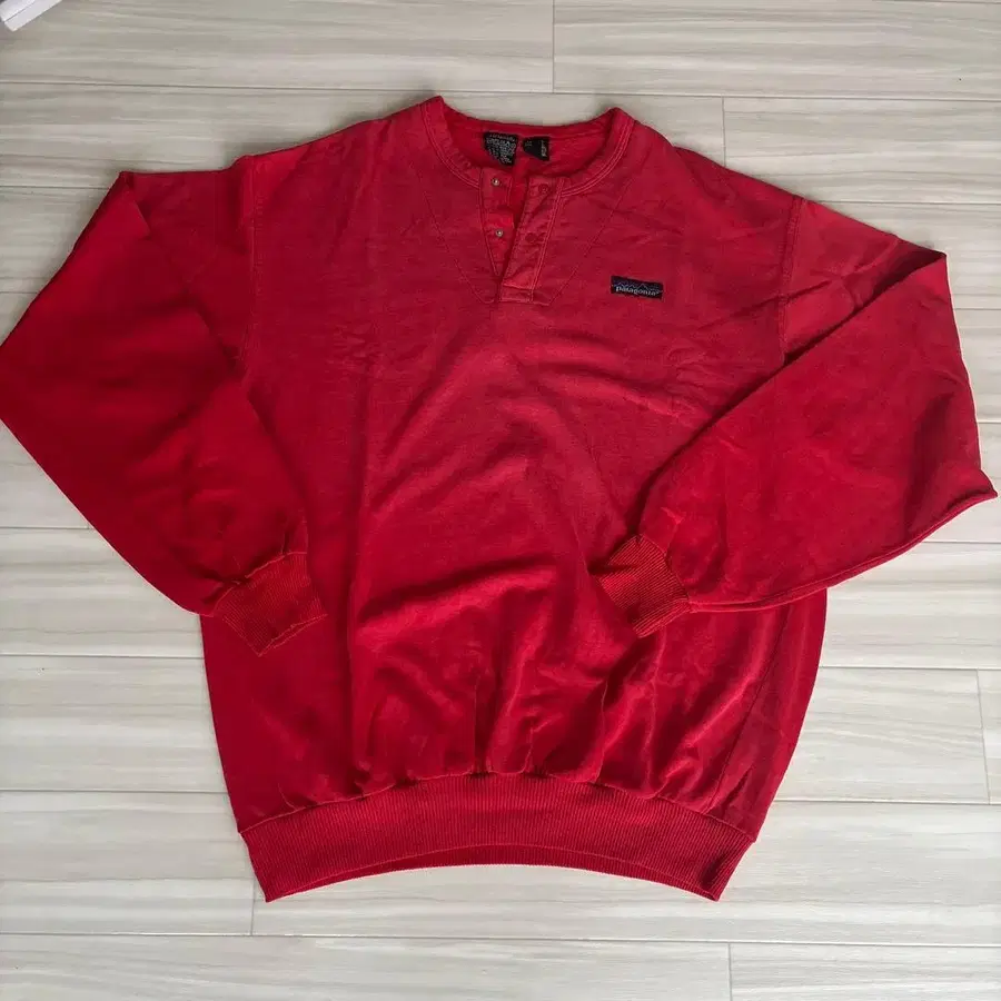 파타고니아 스웨트 셔츠입니다. 1980-90년대 제품으로, 목 부분은 스냅 버튼식 헨리넥입니다. 원단은 티셔츠에 가까운 얇은 소재의 맨투맨으로, 올드 아웃도어 브랜드다운 퇴색된 빨간색 분위기도 매력적입니다. 흔히 볼 수 없는 상품입니다.