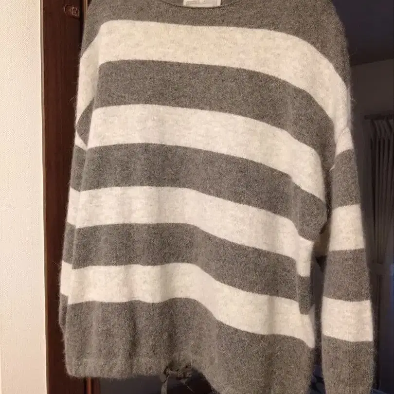 [새상품급] 비어즐리 밑단 리본 보더 니트 그레이 보더