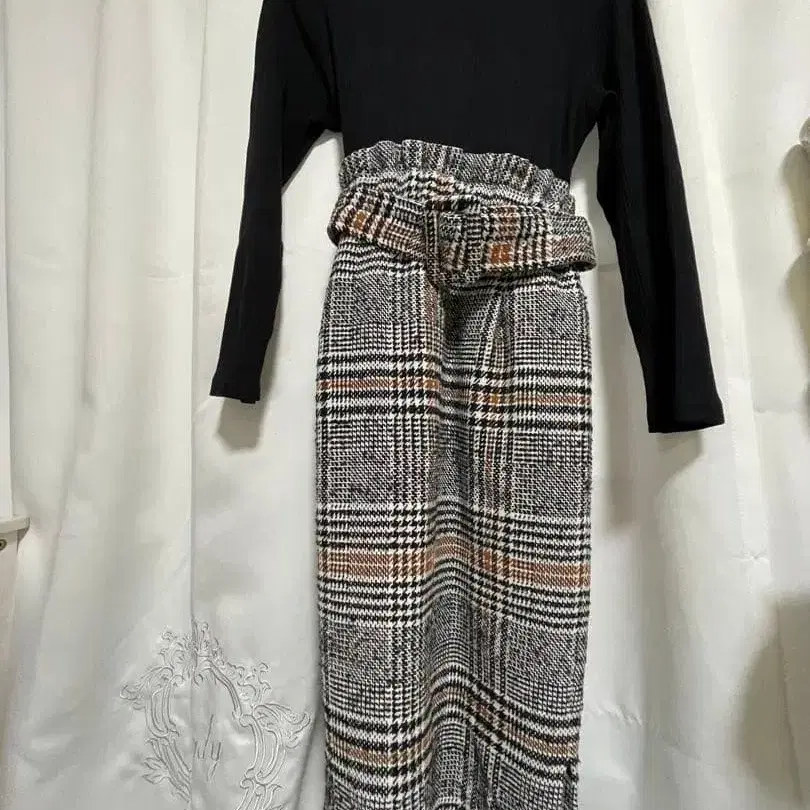 블랙 체크 무늬 롱 원피스