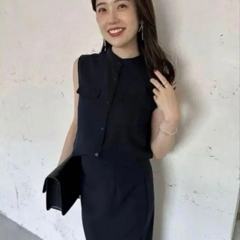 anuans 백 새틴 밴드 카라 슬리브리스 블라우스 블랙