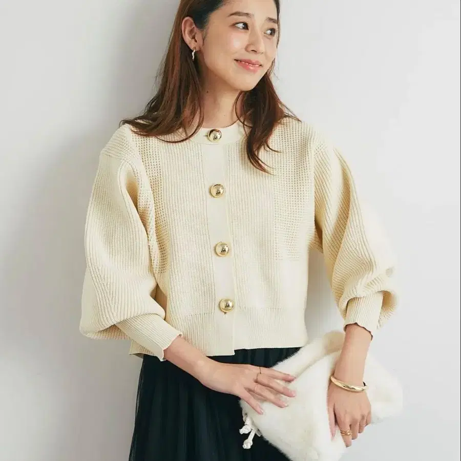 적당한 두께이면서 피부에 닿는 느낌이 산뜻한 니트 소재로 기분 좋으며, 프론트에 베풀어진 빅 사이즈 금장 버튼이 멋스러운 악센트가 됩니다 ◎