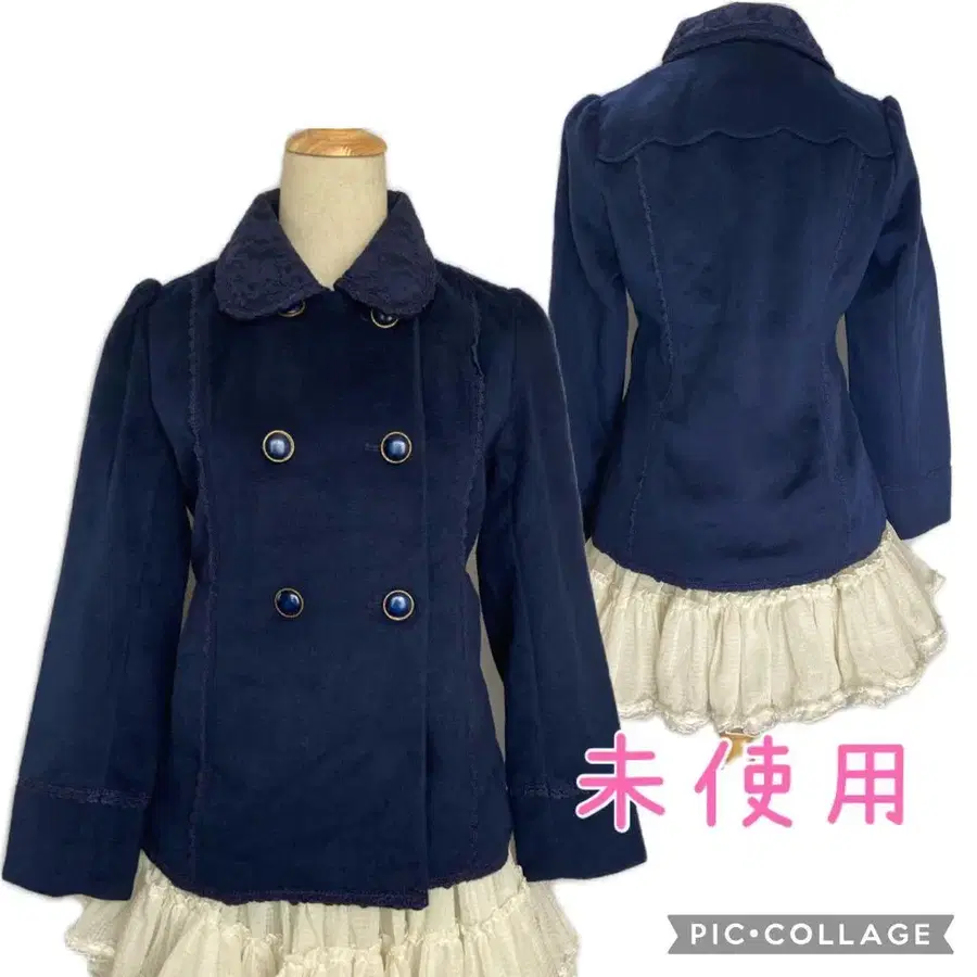 기모 원단에 더블 버튼, 옷깃은 레이스 원단이 겹쳐진 클래시컬한 디자인입니다.