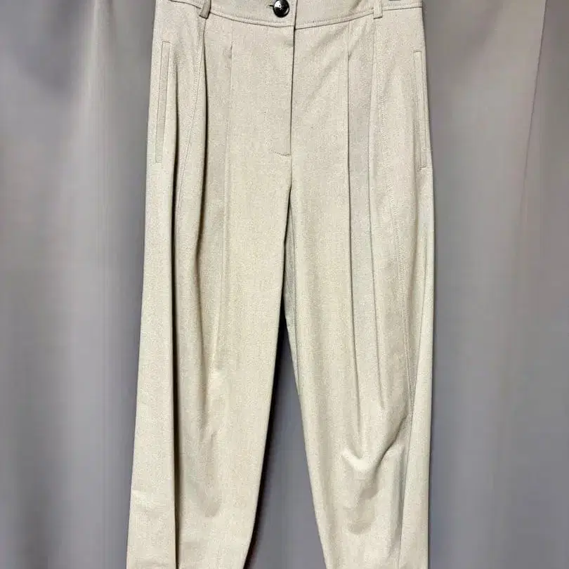 차분한 베이지 컬러로, 깔끔한 스타일부터 캐주얼까지 폭넓게 매치하기 좋은 아이템입니다. 센터 프레스 라인이 다리 라인을 깔끔하게 보이게 하며, 하이웨스트 사양으로 스타일업 효과도 있습니다. 밑단에 버튼 디자인이 있어 은은한 포인트가 됩니다.
