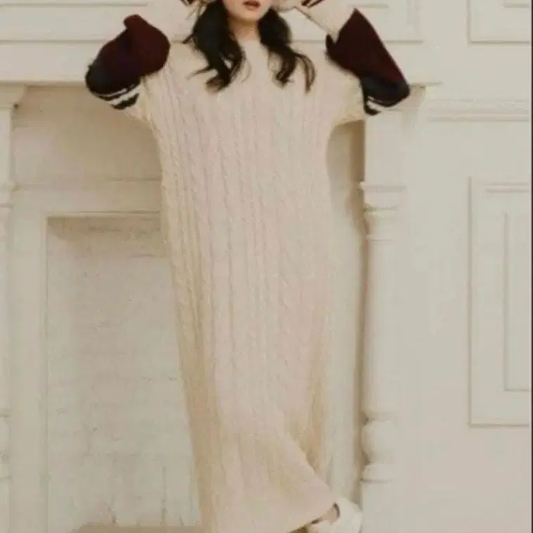 pinue 아이보리 V넥 케이블 짜임 니트 원피스