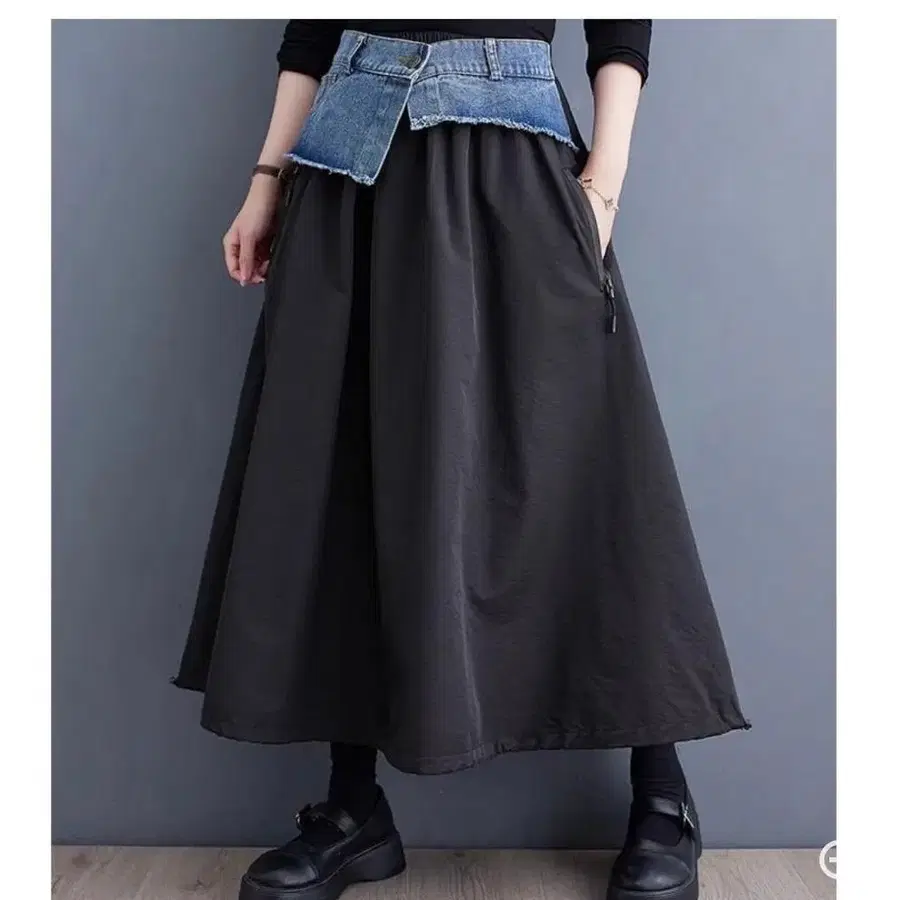 나일론 x 데님 밑단 드로스트 롱 스커트 벌룬