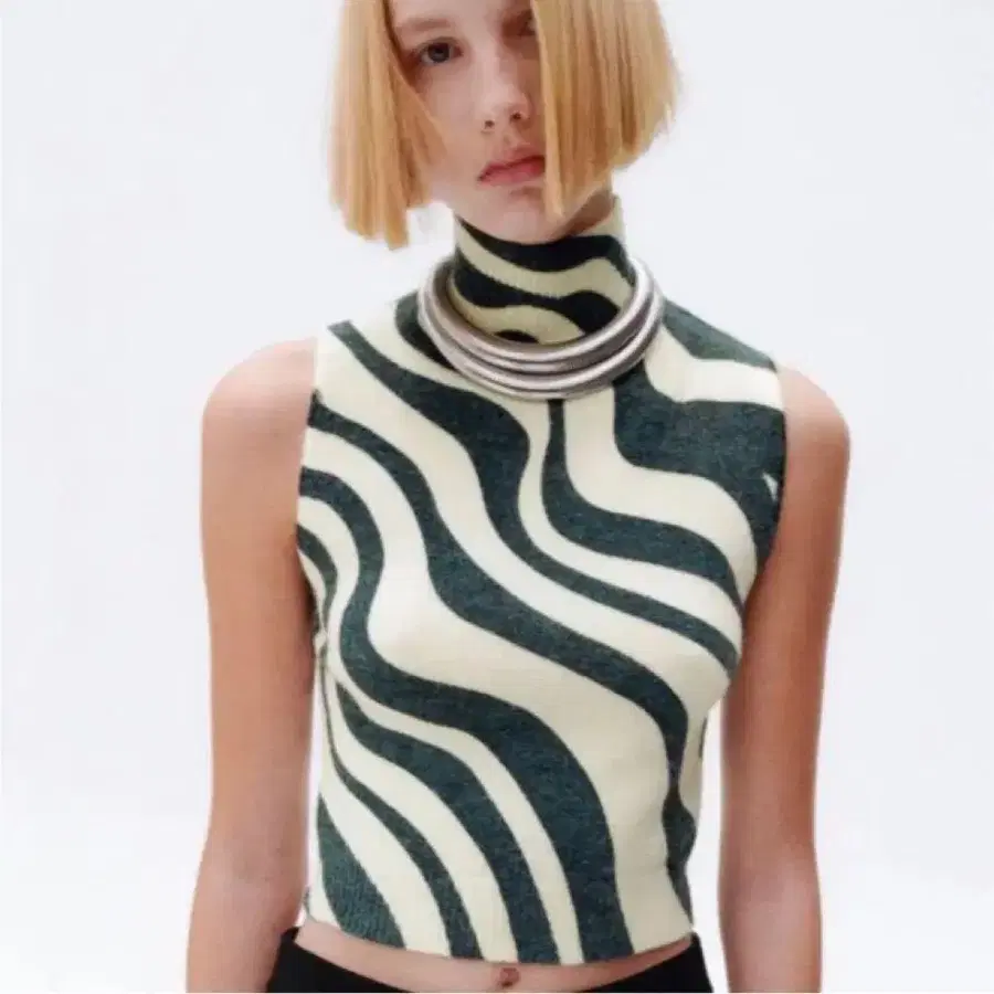 새상품 웨이브 제브라 터틀 하이넥 니트 베스트 아이보리 블랙