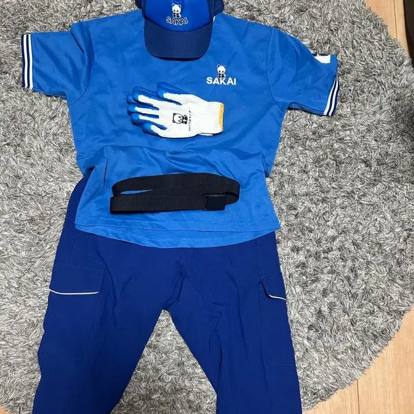 사카이 이사 센터 모자 티셔츠 목장갑 벨트 팬츠입니다.