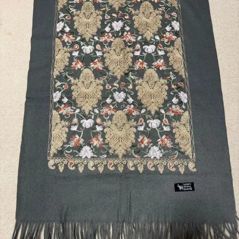 캐시미어 100% 울 꽃무늬 자수 스톨 그레이