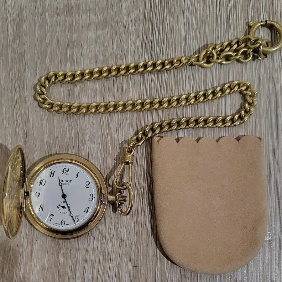 자동 번역되었어요. 원문보기TISSOT 쿼츠 회중시계, 골드 컬러 메탈 소재에 가죽 케이스 포함.