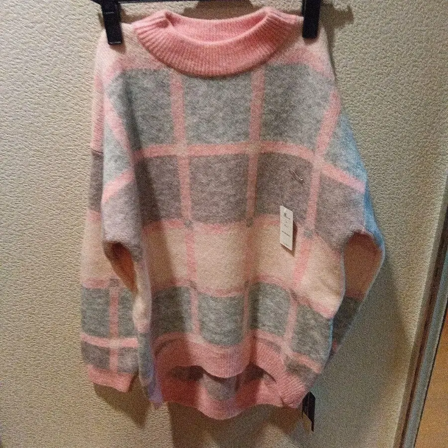 SLENDER 체크 무늬 긴팔 스웨터 그레이 핑크