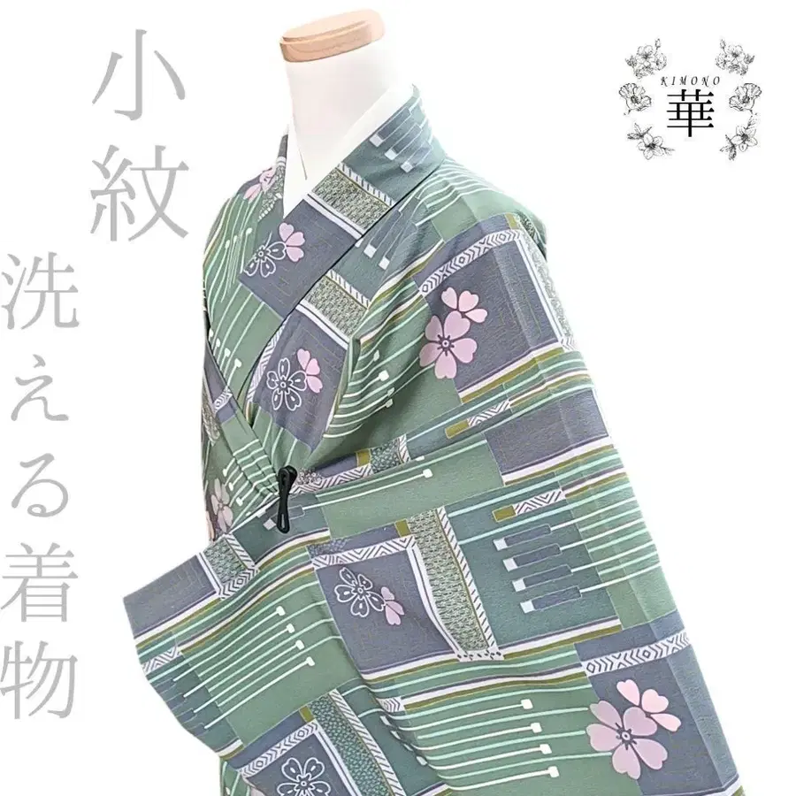 하나 코몬 워셔블 기모노 그린 꽃무늬