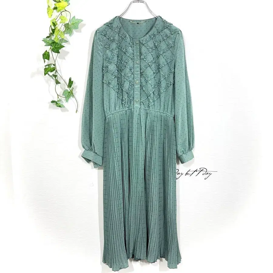 쇼와 레트로 분위기가 감도는 고급스러운 그린 도트 무늬 롱 원피스입니다. 가슴 부분의 섬세한 프릴 디자인과 진주 느낌의 장식이 얼굴 주변을 화려하게 연출합니다. 섬세한 플리츠 스커트가 걸을 때마다 아름답게 흔들리며 여성스러운 실루엣을 만듭니다. 안심할 수 있는 일본제이며, 파티나 특별한 날 외출에도 추천하는 아이템입니다.