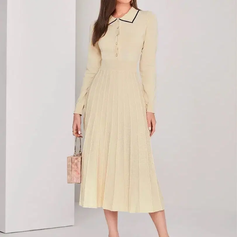 미사용 새상품 크림색 긴팔 니트 원피스 고급 카라 부착 플리츠
