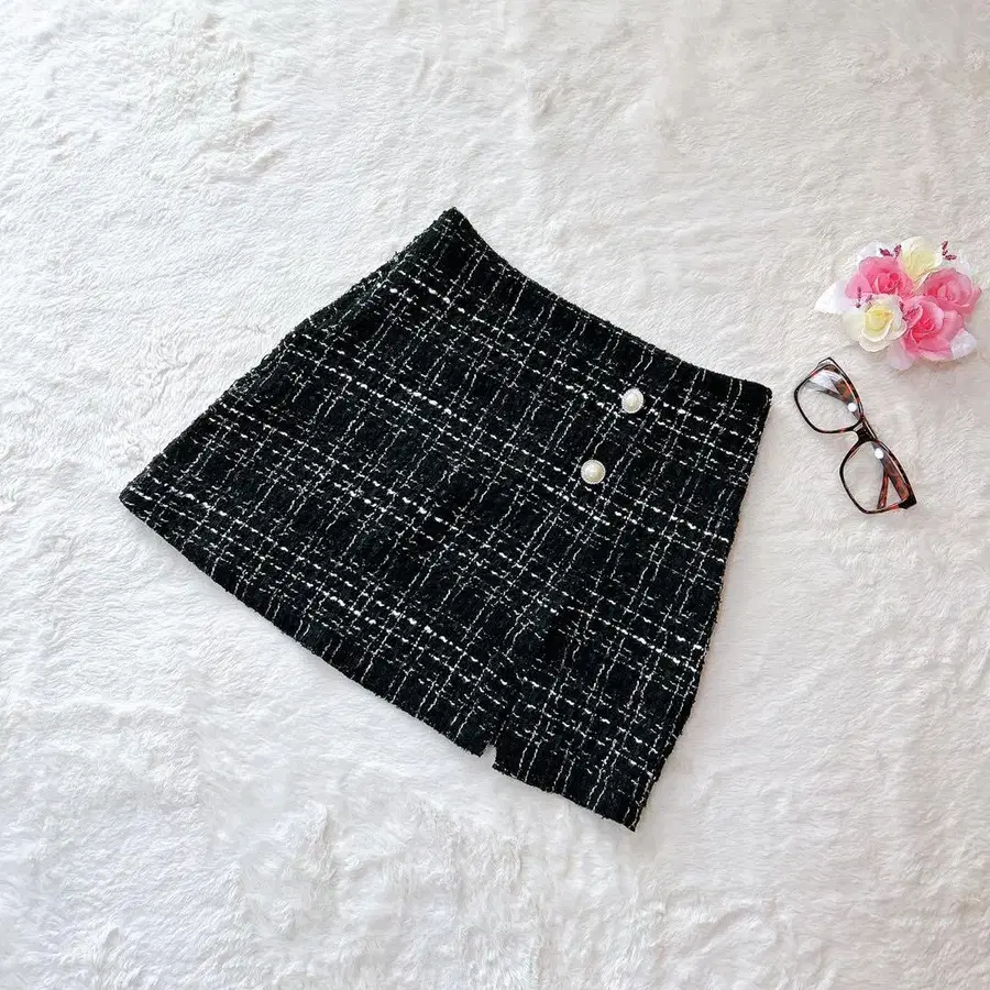 트위드 미니 스커트 깔끔한 라메 블랙 펄 슬릿 여성용