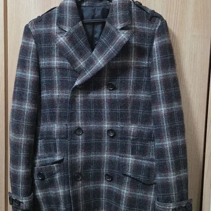 울 100% 체크 무늬 더블 브레스트 피 코트