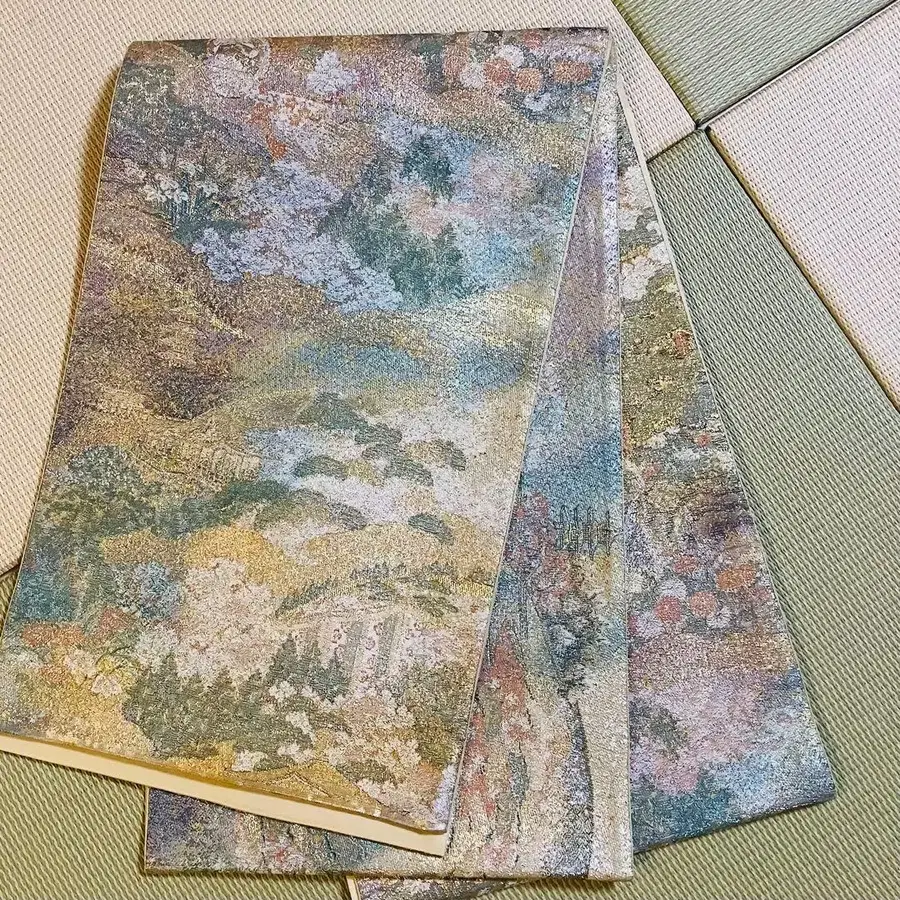 자연 풍경 금실 자수 블러 후쿠로 오비 그린 금각사 m1202