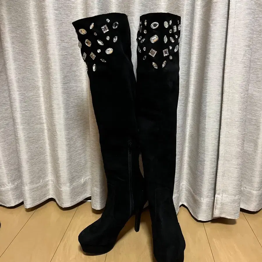 비쥬 장식 블랙 스웨이드 니하이 부츠