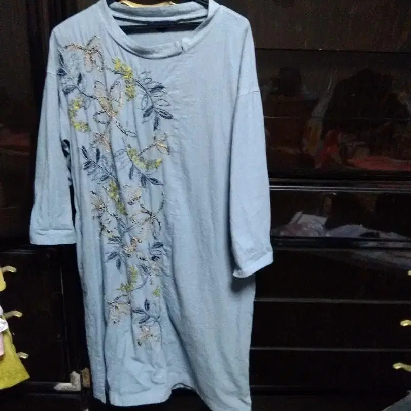 파랑 꽃무늬 자수 오분 소매 튜닉