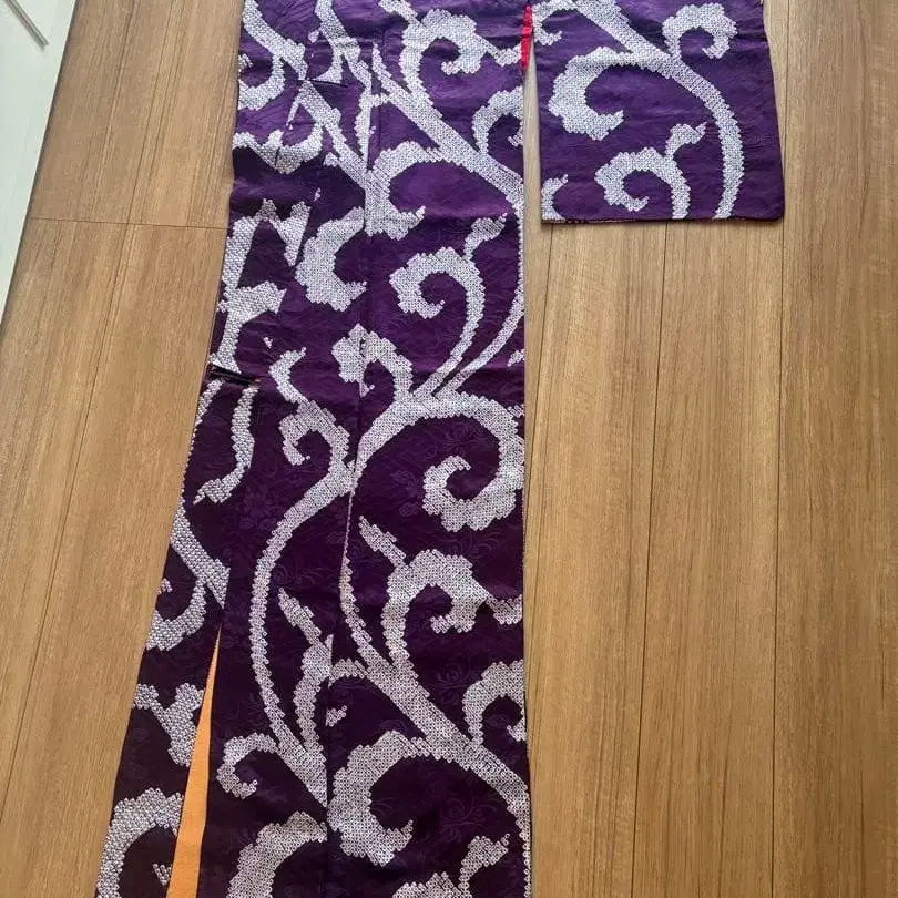 지문이 있는 보라색 바탕에 쥐방울로 대담한 덩굴 무늬를 그린 앤티크 코몬입니다. 전전의 것이라고 생각합니다. 홍견은 어쩔 수 없이 약해서, 사진과 같이 일부 찢어졌지만, 손바느질로 겉감과 하치카케는 튼튼하며, 현대에는 없는 앤티크다운 패턴이기 때문에, 재단直し나 부분直し를 하면 좋을 것 같습니다. 신경 쓰이지 않는다면 이대로 착용 가능합니다. 저는 그대로 입고 있었습니다. 앤티크치고는 화장이 길고, 소매 길이도 길어 우아한 분위기입니다. 다양한 오비를 맞추기 쉬운 기모노입니다.