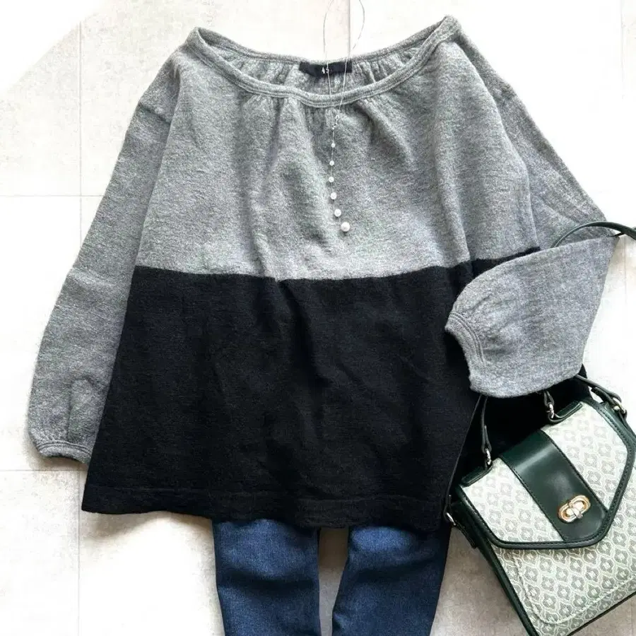울 천축 소재를 사용한, 45R다운 부드러운 질감의 바이컬러 블라우스입니다.