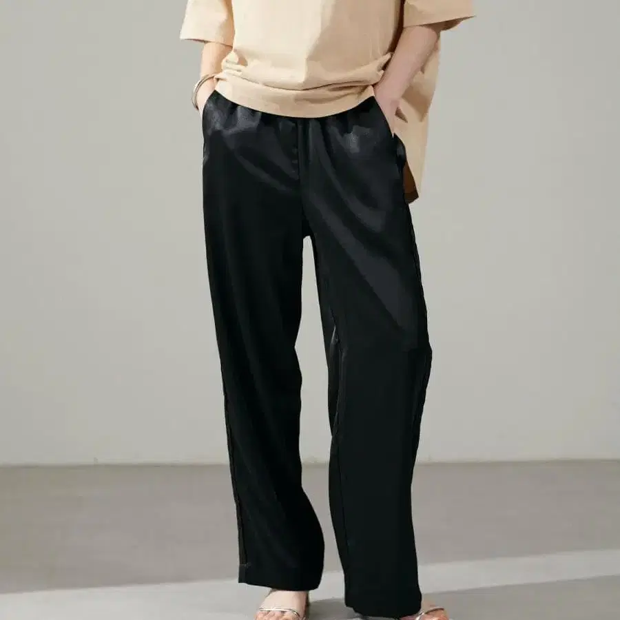 사이드 라인과 광택이 있는 새틴 원단이 코디네이트의 포인트가 되는 이지 팬츠.