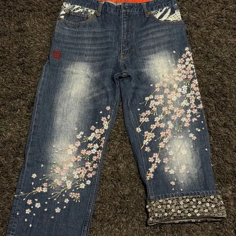 류기앗사쿠 카라쿠리타마시 벚꽃 자수 데님 팬츠