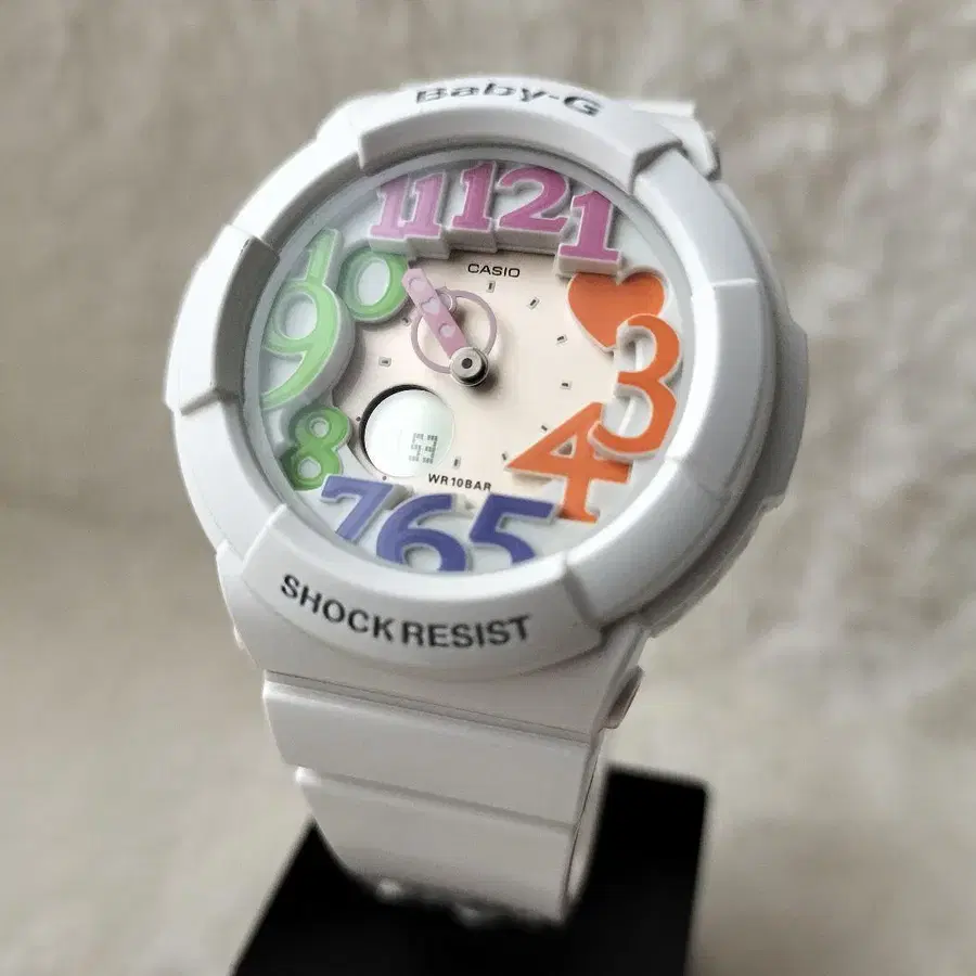 베이스 컬러에는 화이트를 채용. 라이트 점등 시에는 입체적으로 배치된 크고 작은 인덱스나 바늘 등이 어둠 속에서 컬러풀하게 떠오르는 네온 일루미네이터가 장착되어 있습니다. 또한, 임팩트 있는 빅 케이스를 채용. 패션의 악센트가 되는 BABY-G입니다.