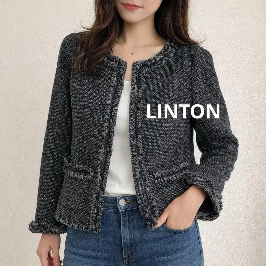 린 LINTON 트위드 노카라 자켓 그레이 블랙 11호 L