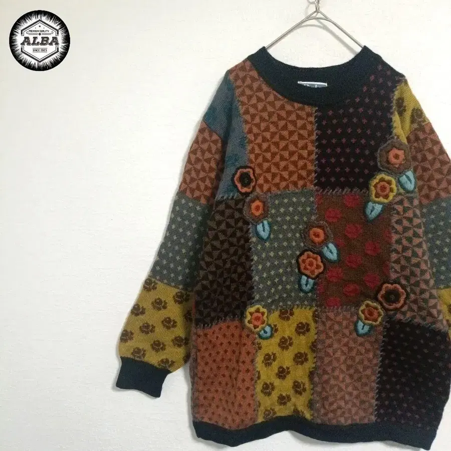 스웨터 니트 꽃무늬 자수 패치워크풍 레트로 기하학 패턴 걸리시 블랙