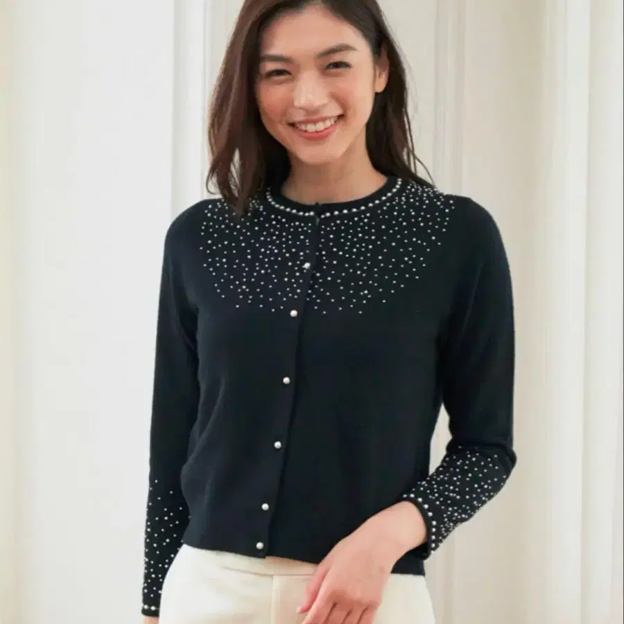 가슴 부분과 소매에 펄이 디자인된 멋진 가디건입니다.